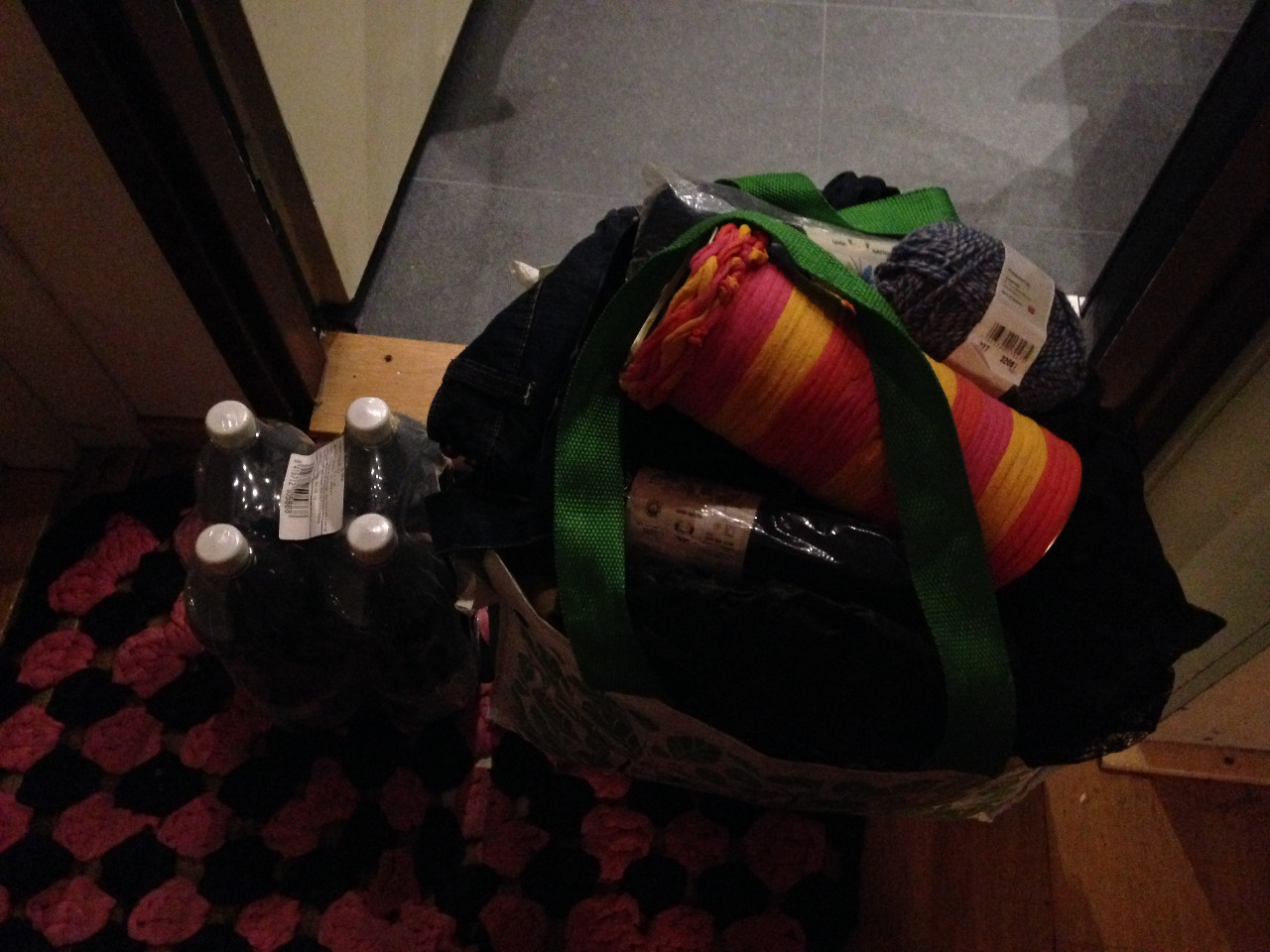 Lopulta vietin kaksi tuntia tämän uuden tuttavuuteni luona ja autoin lajittelemaan käsityötarvikkeita ja toki siinä kävi niin, että mukaani tarttui kaksi isoa kassillista erilaista käsityötilperhööriä (hän tyhjentelee varastojaan). Kankaita, lankoja, helmiä, paljetteja, hileitä ja muuta sellaista sangen tarpeellista tavaraa.